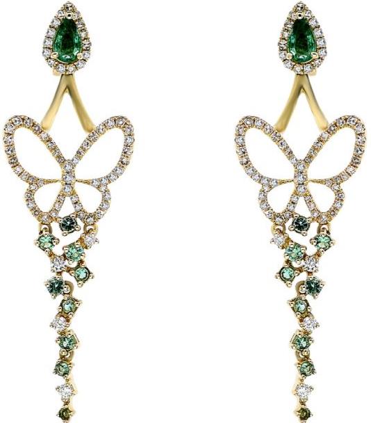 1.20CT DIAMOND & AAA EMERALD 14KT YELLOW GOLD BUTTERFLY CLUSTER HANGING EARRINGS