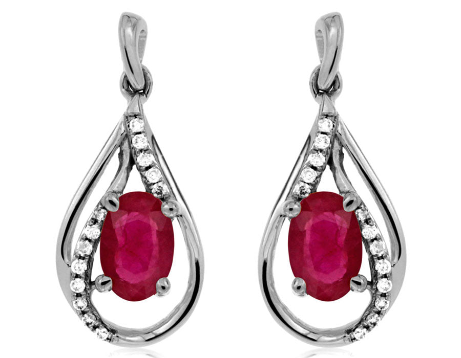 14KT WHITE GOLD HANGING EARRINGS. 3D CLASSIC TEAR DROP DESIGN. ROUND DIAMONDS ARE F/G COLOR, VSSI CLARITY .10 CARATS. AAA OVAL RUBIES ARE 1.10 CARATS. WRITTEN APPRAISAL AVAILABLE. COMES IN A PRESENTABLE GIFT BOX.