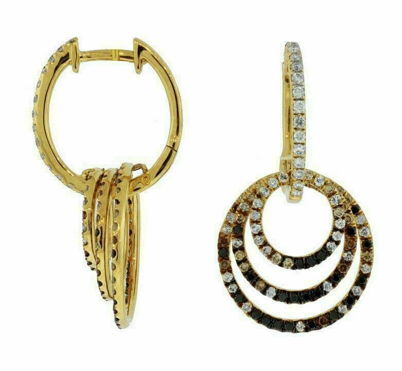 1.20CT WHITE BLACK & MOCHA DIAMOND 14KT YELLOW GOLD 3D CIRCULAR HANGING EARRINGS