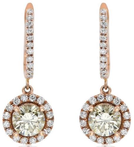 14KT ROSE GOLD HANGING EARRINGS. 3D CLASSIC SOLITAIRE HALO DESIGN. ROUND WHITE DIAMONDS ARE F/G COLOR, VSSI CLARITY .40 CARATS. ROUND FANCY YELLOW DIAMONDS ARE .82 CARATS.