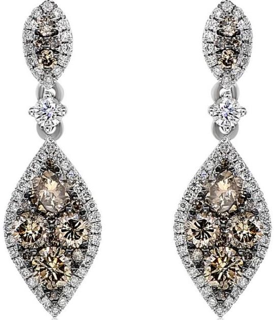 14KT WHITEGOLD HANGINGEARRINGS. 3D MARQUISE SHAPEDESIGN. WHITE DIAMONDS ARE F/G COLOR, VSSI CLARITY .30 CARATS. CHOCOLATE FANCY DIAMONDS ARE .92 CARATS. WRITTEN APPRAISAL AVAILABLE. COMES IN A PRESENTABLE GIFT BOX.