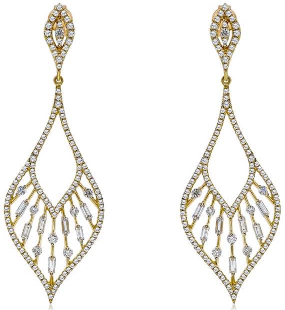 14KT YELLOW GOLD HANGING EARRINGS. 3D OPEN FILIGREE TEAR DROP DESIGN. ROUND AND BAGUETTE DIAMONDS ARE F/G COLOR, VSSI CLARITY 1.24 CARATS. WRITTEN APPRAISAL AVAILABLE. COMES IN A PRESENTABLE GIFT BOX.