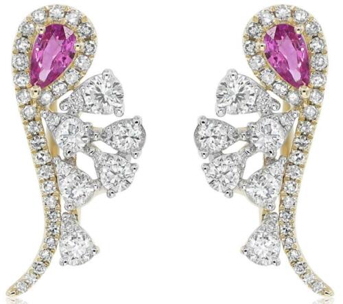 14KT WHITE AND YELLOW GOLD FUN HANGING EARRINGS. 3D FLORAL DESIGN. ROUND DIAMONDS ARE F/G COLOR, VSSI CLARITY .90 CARATS. AAA PEAR SHAPE PINK SAPPHIRES ARE .34 CARATS. WRITTEN APPRAISAL AVAILABLE. COMES IN A PRESENTABLE GIFT BOX.