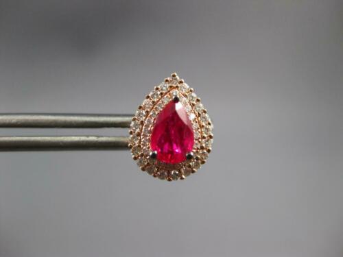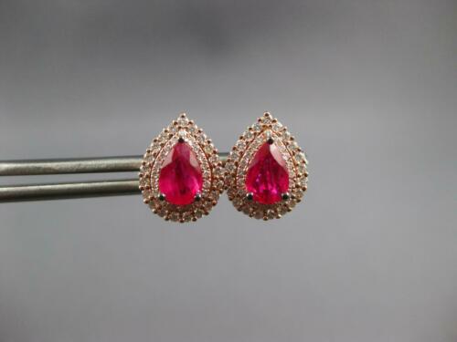14KT ROSE GOLD STUD EARRINGS. 3D DOUBLE HALO TEAR DROP CLASSIC DESIGN. ROUND DIAMONDS ARE F/G COLOR, VSSI CLARITY .35 CARATS. AAA EXTRA FACETED PEAR SHAPE RUBIES ARE .89 CARATS. RUBIES MEASURE 6.5mm WIDE. EARRINGS MEASURE 6.5mm X 11mm. WRITTEN APPRAISAL AVAILABLE. COMES IN A PRESENTABLE GIFT BOX.
