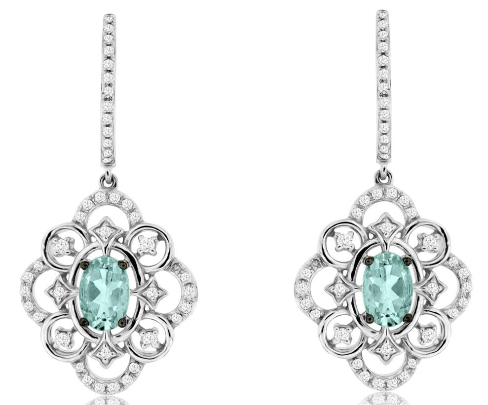 1.25CT DIAMOND & AAA AQUAMARINE 14K WHITE GOLD 3D OVAL FILIGREE HANGING EARRINGS