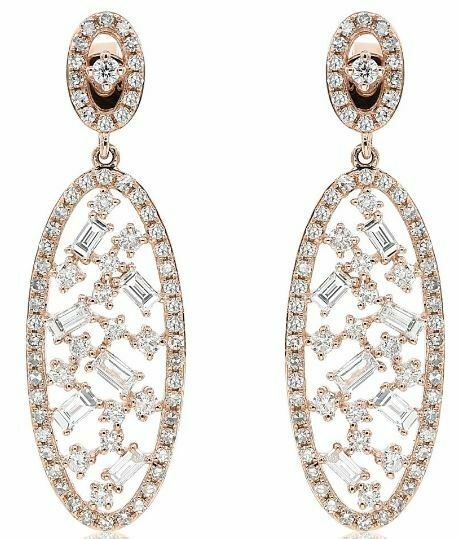 14KT ROSE GOLD HANGING EARRINGS. 3D OVAL OPEN FILIGREEDESIGN. ROUND AND BAGUETTEDIAMONDS ARE F/G COLOR, VSSI CLARITY 1.27 CARATS. WRITTEN APPRAISAL AVAILABLE. COMES IN A PRESENTABLE GIFT BOX.
