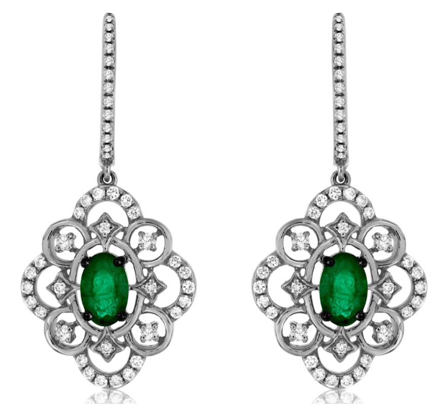 1.27CT DIAMOND & AAA EMERALD 14KT WHITE GOLD OVAL OPEN FILIGREE HANGING EARRINGS
