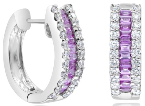 18KT WHITE GOLD HUGGIE EARRINGS. 3D THREE ROW CLASSIC DESIGN. ROUND DIAMONDS ARE F/G COLOR, VSSI CLARITY .57 CARATS. AAA BAGUETTE PINK SAPPHIRES ARE .71 CARATS. WRITTEN APPRAISAL AVAILABLE. COMES IN A PRESENTABLE GIFT BOX.