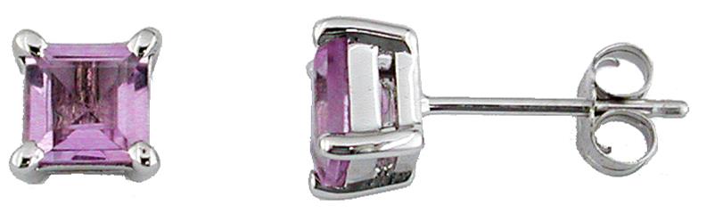 14KT WHITE GOLD STUD EARRINGS. 3D CLASSIC SQUARE FOUR PRONG DESIGN. AAA EXTRA FACETED PRINCESS CUT PINK AMETHYSTS ARE 1.20 CARATS. WRITTEN APPRAISAL AVAILABLE. COMES IN A PRESENTABLE GIFT BOX.