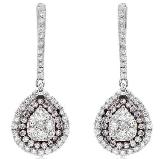 1.2CT WHITE & PINK DIAMOND 18K WHITE GOLD TEAR DROP DOUBLE HALO HANGING EARRINGS