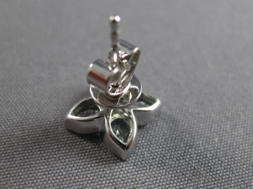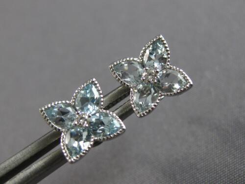 14KT WHITE GOLD STUD EARRINGS. 3D FILIGREE FLOWER DESIGN. ROUND DIAMONDS ARE F/G COLOR, VSSI CLARITY .06 CARATS. AAA PEAR SHAPE AQUAMARINES ARE 1.25 CARATS. MEASURES 8mm WIDE. WRITTEN APPRAISAL AVAILABLE. COMES IN A PRESENTABLE GIFT BOX.