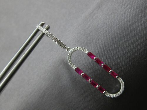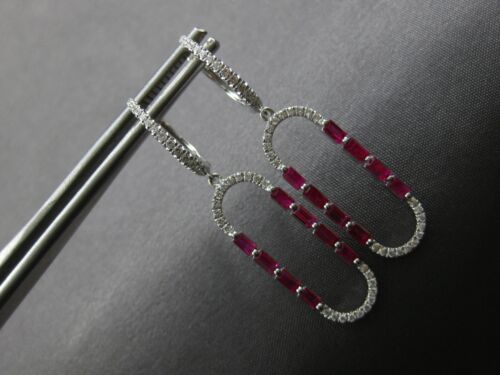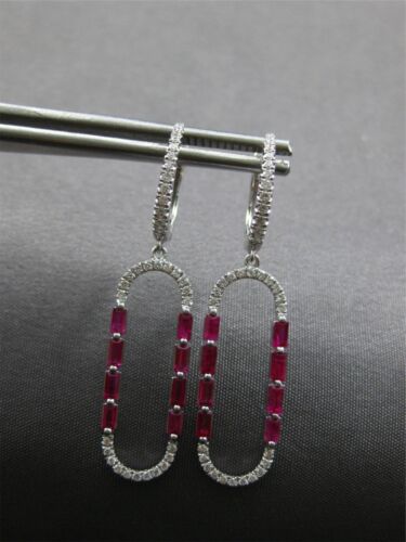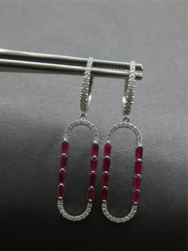 14KT WHITE GOLD FUN HANGING EARRINGS. 3D OPEN OVAL DESIGN. ROUND DIAMONDS ARE F/G COLOR, VSSI CLARITY .30 CARATS. AAA BAGUETTE RUBIES ARE 1.02 CARATS. MEASURES 35.5mm X 9.5mm. WRITTEN APPRAISAL AVAILABLE. COMES IN A PRESENTABLE GIFT BOX.