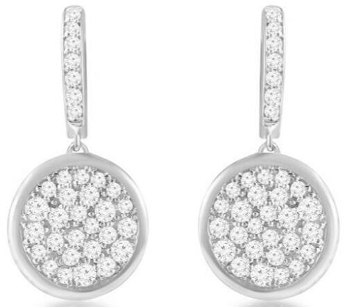 14KT WHITE GOLD FUN HUGGIE HANGING EARRINGS. 3D CLASSIC CLUSTER PAVE CIRCULAR DESIGN. ROUND DIAMONDS ARE F/G COLOR, VSSI CLARITY 1.35 CARATS.