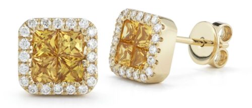 14KT YELLOW GOLD STUD EARRINGS. 3D INVISIBLE SQUARE HALO DESIGN. ROUND DIAMONDS ARE F/G COLOR, VSSI CLARITY .20 CARATS. AAA PRINCESS CUT YELLOW SAPPHIRES ARE 1.16 CARATS. WRITTEN APPRAISAL AVAILABLE. COMES IN A PRESENTABLE GIFT BOX.