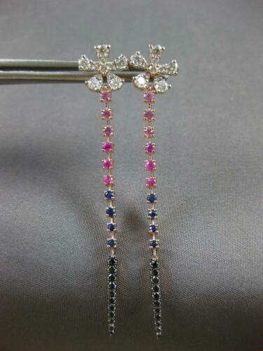 14KT ROSE GOLD HANGING EARRINGS. 3D FLOWER DESIGN. WHITE DIAMONDS ARE F/G COLOR, VSSI CLARITY. WHITE AND BLACK DIAMONDS ARE .61 CARATS. AAA MULTI COLOR SAPPHIRES ARE .77 CARATS. MEASURES 55mm X 9.5mm. WRITTEN APPRAISAL AVAILABLE. COMES IN A PRESENTABLE GIFT BOX.