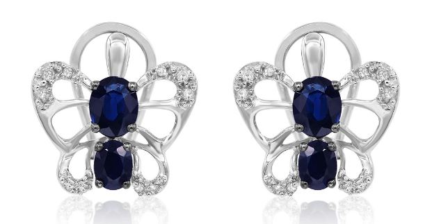 14KT WHITE GOLD EARRINGS. 3D BUTTERFLY DESIGN. ROUND DIAMONDS ARE F/G COLOR, VSSI CLARITY .11 CARATS. AAA OVAL SAPPHIRES ARE 1.28 CARATS.WRITTEN APPRAISAL AVAILABLE. COMES IN A PRESENTABLE GIFT BOX.
