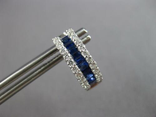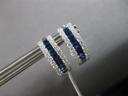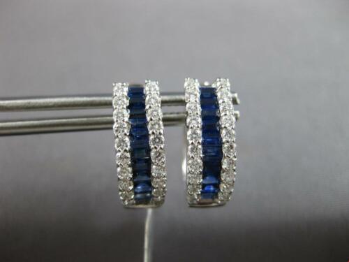 18KT WHITE GOLD HUGGIE HOOP HANGING EARRINGS. 3D CLASSIC THREE ROW DESIGN. ROUND DIAMONDS ARE F/G COLOR, VSSI CLARITY .57 CARATS. AAA BAGUETTE SAPPHIRES ARE .82 CARATS. MEASURES 5MM WIDE. WRITTEN APPRAISAL AVAILABLE. COMES IN A PRESENTABLE GIFT BOX.