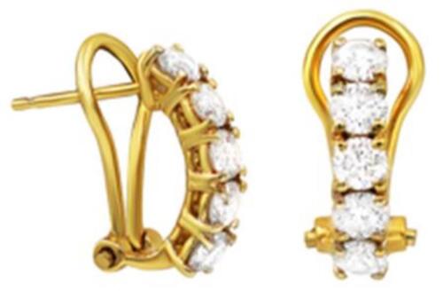 18KT YELLOW GOLD HANGING EARRINGS. 3D CLASSIC FIVE STONE SEMI CIRCULAR CLIP ON DESIGN. ROUND DIAMONDS ARE G/H COLOR, VSSI CLARITY 1.3 CARATS.