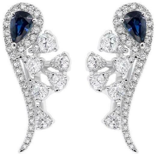 14KT WHITE GOLD HANGINGEARRINGS. 3D FLOWER DESIGN. ROUND DIAMONDS ARE F/G COLOR, VSSI CLARITY .90 CARATS. AAA PEAR SHAPE SAPPHIRES ARE .50 CARATS.WRITTEN APPRAISAL AVAILABLE. COMES IN A PRESENTABLE GIFT BOX.