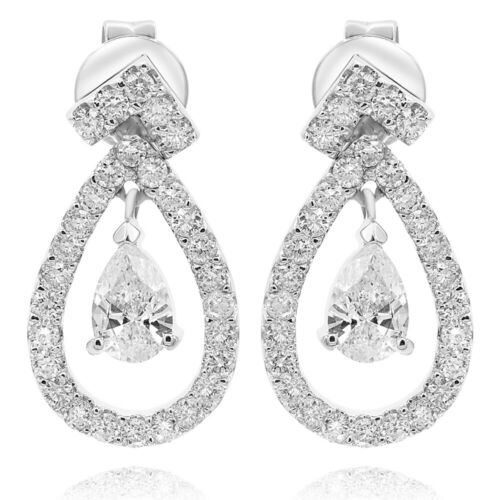 1.45CT DIAMOND 14KT WHITE GOLD 3D ROUND & PEAR SHAPE TEAR DROP HANGING EARRINGS
