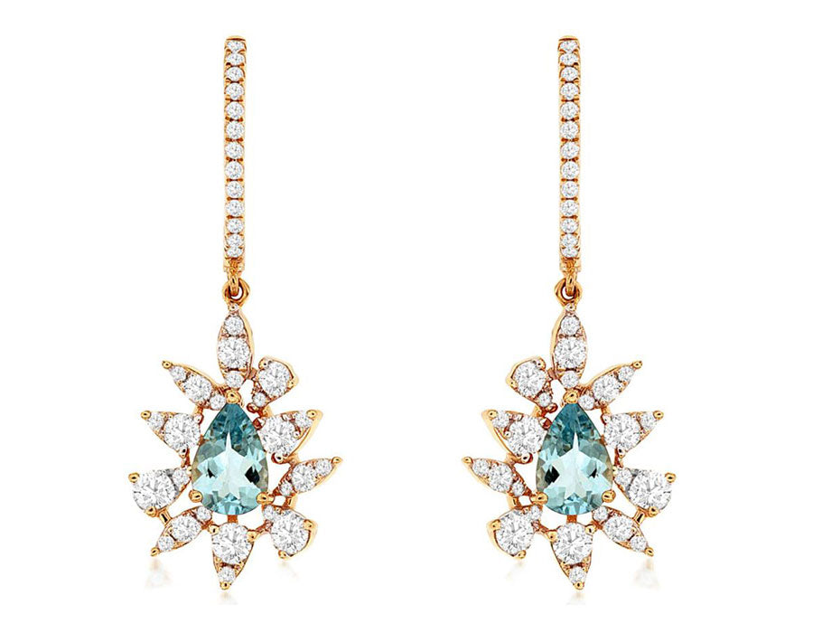 14KT WHITE GOLD LEVERBACK HANGING EARRINGS. 3D FLOWER DESIGN. ROUND DIAMONDS ARE F/G COLOR, VSSI CLARITY .75 CARATS. AAA PEAR SHAPE AQUAMARINES ARE .70 CARATS. WRITTEN APPRAISAL AVAILABLE. COMES IN A PRESENTABLE GIFT BOX.