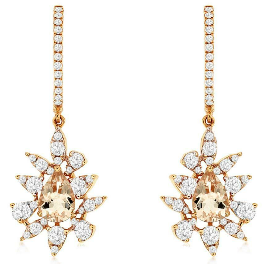 14KT ROSE GOLD HANGING EARRINGS. 3D FLOWER SNOWFLAKE DESIGN. ROUND DIAMONDS ARE F/G COLOR, VSSI CLARITY .75 CARATS. AAA PEAR SHAPE MORGANITES ARE .70 CARATS. WRITTEN APPRAISAL AVAILABLE. COMES IN A PRESENTABLE GIFT BOX.