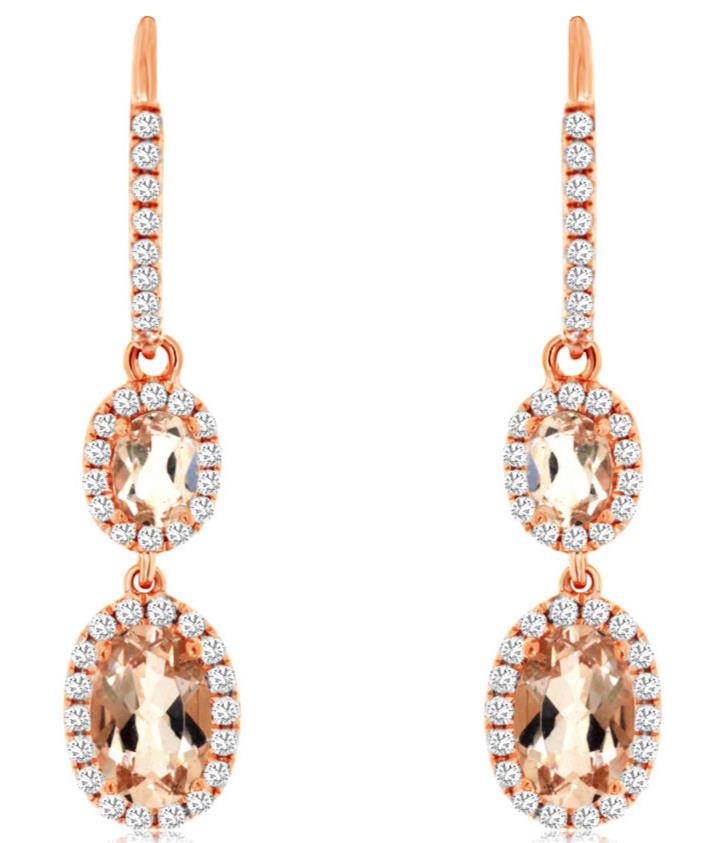 14KT ROSE GOLD LEVERBACK HANGING EARRINGS. 3D DOUBLE FLOWER DESIGN. ROUND DIAMONDS ARE F/G COLOR, VSSI CLARITY .30 CARATS. AAA EXTRA FACETED OVAL MORGANITES ARE 1.15 CARATS. WRITTEN APPRAISAL AVAILABLE. COMES IN A PRESENTABLE GIFT BOX.