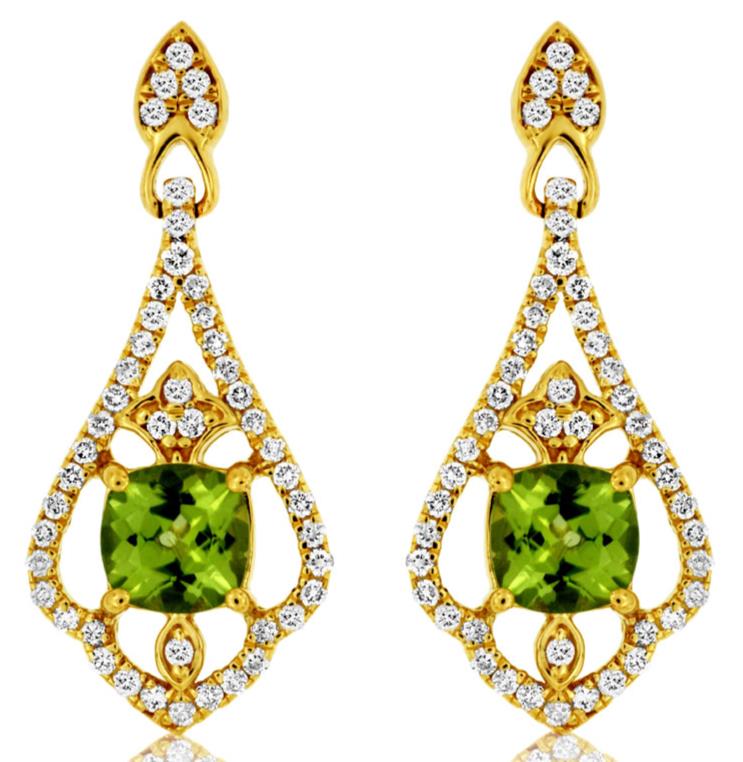 14KT YELLOW GOLD HANGING EARRINGS. 3D FLORAL TEAR DROP DESIGN. ROUND DIAMONDS ARE F/G COLOR, VSSI CLARITY .38 CARATS. AAA EXTRA FACETED CUSHION CUT PERIDOTS ARE 1.08 CARATS. WRITTEN APPRAISAL AVAILABLE. COMES IN A PRESENTABLE GIFT BOX.