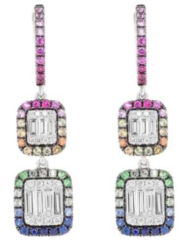 14KT WHITE GOLD FUN HANGING EARRINGS. 3D DOUBLE SQUARE RAINBOW DESIGN. DIAMONDS ARE F/G COLOR, VSSI CLARITY. ROUND DIAMONDS ARE .11 CARATS. BAGUETTE DIAMONDS ARE .53 CARATS. AAA MULTI COLOR SAPPHIRES ARE .85 CARATS. WRITTEN APPRAISAL AVAILABLE. COMES IN A PRESENTABLE GIFT BOX.