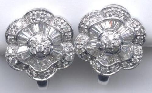 14KT WHITE GOLD HANGING EARRINGS. 3D FLOWER CLIP ON DESIGN. ROUND AND BAGUETTE DIAMONDS ARE F/G COLOR, VSSI CLARITY 1.50 CARATS. WRITTEN APPRAISAL AVAILABLE. COMES IN A PRESENTABLE GIFT BOX.