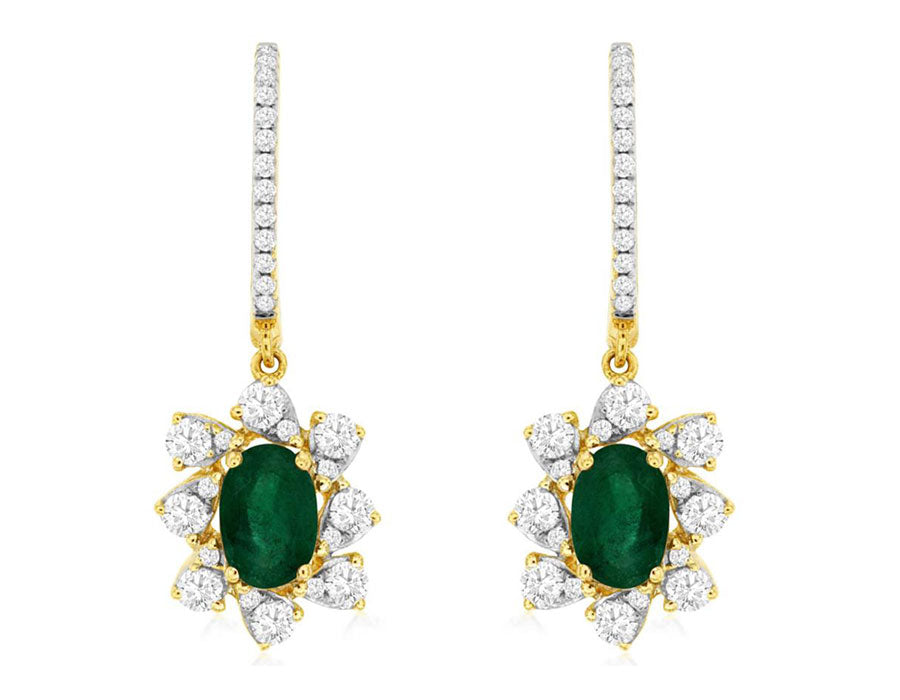 1.50CT DIAMOND & AAA EMERALD 14KT YELLOW GOLD FLOWER LEVERBACK HANGING EARRINGS