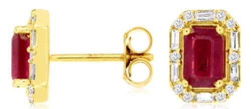 1.52CT DIAMOND & AAA RUBY 14K YELLOW GOLD EMERALD CUT & ROUND HALO STUD EARRINGS