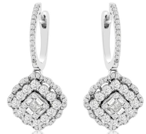 14KT WHITE GOLD HANGING EARRINGS. 3D SQUARE GEOMETRICAL FLOWER DESIGN. ROUND, PRINCESS CUT, AND BAGUETTE DIAMONDS ARE F/G COLOR, VSSI CLARITY 1.53 CARATS. WRITTEN APPRAISAL AVAILABLE. COMES IN A PRESENTABLE GIFT BOX.