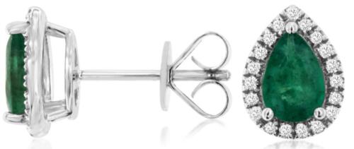 14KT WHITE GOLD STUD EARRINGS. 3D CLASSIC HALO TEAR DROP DESIGN. ROUND DIAMONDS ARE F/G COLOR, VSSI CLARITY .20 CARATS. AAA PEAR SHAPE EMERALD IS 1.35 CARATS. WRITTEN APPRAISAL AVAILABLE. COMES IN A PRESENTABLE GIFT BOX.
