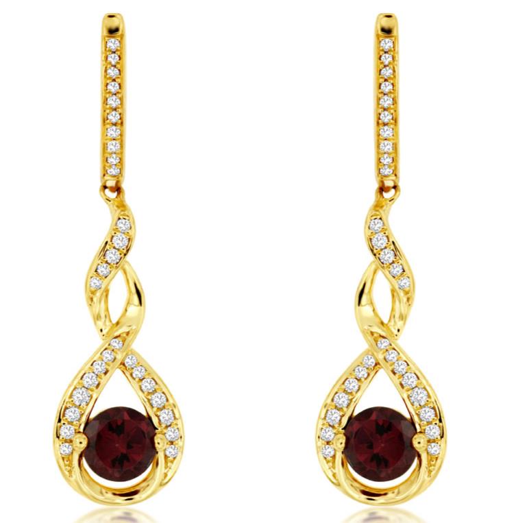 14KT YELLOW GOLD HANGING EARRINGS. 3D TEAR DROP INFINITY DESIGN. ROUND DIAMONDS ARE F/G COLOR, VSSI CLARITY .25 CARATS. AAA EXTRA FACETED RHODOLITES ARE 1.30 CARATS. WRITTEN APPRAISAL AVAILABLE. COMES IN A PRESENTABLE GIFT BOX.