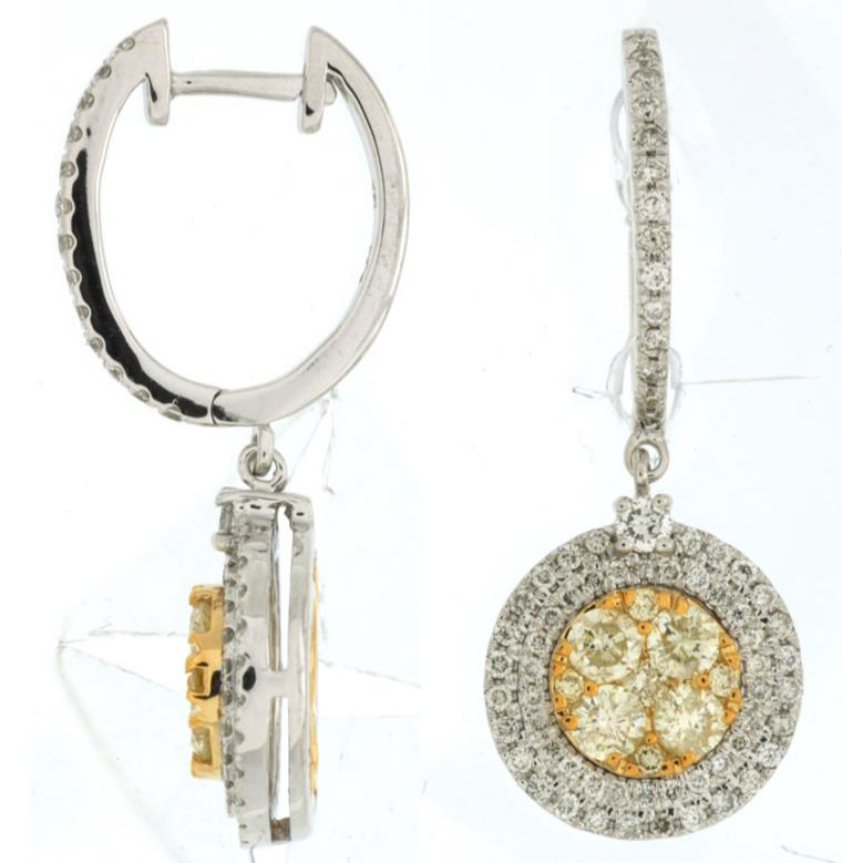 14KT WHITE GOLD FUN HUGGIE HANGING EARRINGS. 3D FLOWER HALO DESIGN. ROUND WHITE DIAMONDS ARE F/G COLOR, VSSI CLARITY .68 CARATS. FANCY YELLOW DIAMONDS ARE .88 CARATS. WRITTEN APPRAISAL AVAILABLE. COMES IN A PRESENTABLE GIFT BOX.