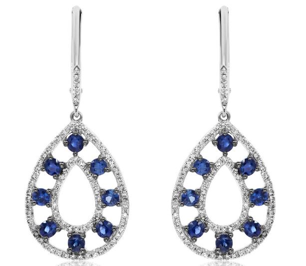 14KT WHITE GOLD LEVERBACK HANGINGEARRINGS. 3D ETOILE TEAR DROPDESIGN. DIAMONDS ARE F/G COLOR, VSSI CLARITY .47CARATS. AAA SAPPHIRESARE 1.12 CARATS.WRITTEN APPRAISAL AVAILABLE. COMES IN A PRESENTABLE GIFT BOX.