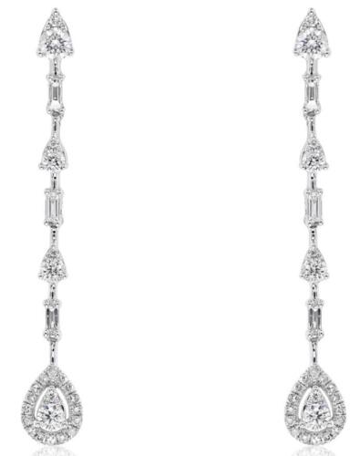 14KT WHITE GOLD HANGING EARRINGS. 3D HALO BY THE YARD TEAR DROP DESIGN. ROUND AND BAGUETTE DIAMONDS ARE F/G COLOR, VSSI CLARITY 1.60 CARATS. WRITTEN APPRAISAL AVAILABLE. COMES IN A PRESENTABLE GIFT BOX.