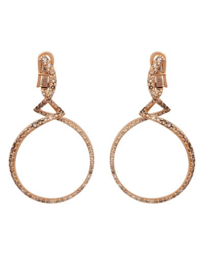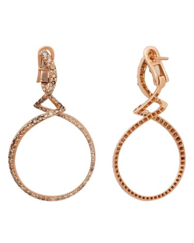 18KT ROSE GOLD CLIP ON HANGING EARRINGS. 3D CIRCULAR CRISS CROSS DESIGN. MULTI COLOR DIAMONDS ARE 1.60 CARATS. WRITTEN APPRAISAL AVAILABLE. COMES IN A PRESENTABLE GIFT BOX.