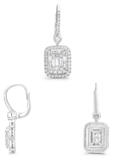 14KT WHITE GOLD LEVERBACK HANGING EARRINGS. 3D CLASSIC SQUARE CLUSTER INVISIBLE DESIGN. DIAMONDS ARE F/G COLOR, VS CLARITY. ROUND DIAMONDS ARE .89 CARATS. BAGUETTE DIAMONDS ARE .75 CARATS.