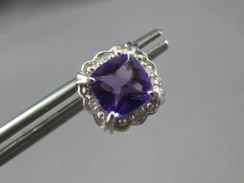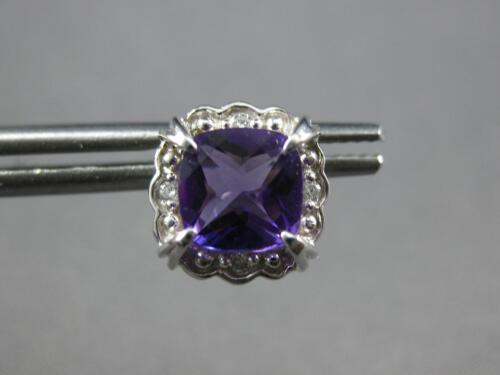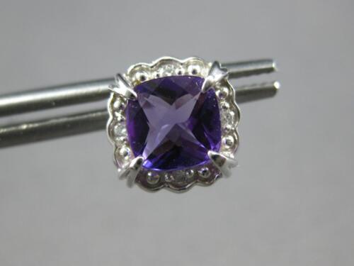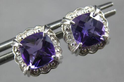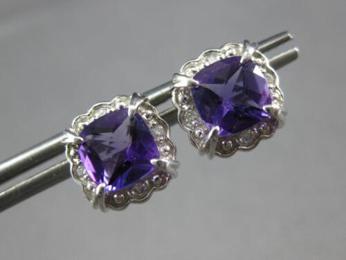 14KT WHITE GOLD STUD EARRINGS. 3D CLASSIC HALO FLORAL DESIGN. ROUND DIAMONDS ARE F/G COLOR, VSSI CLARITY ARE .07 CARATS. AAA EXTRA FACETED CUSHION CUT AMETHYSTS ARE 1.60 CARATS. MEASURES 10mm WIDE. WRITTEN APPRAISAL AVAILABLE. COMES IN A PRESENTABLE GIFT BOX.