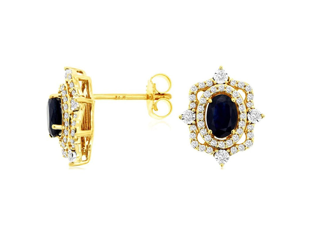 14KT YELLOW GOLD STUD EARRINGS. 3D FLOWER SQUARE DESIGN. ROUND DIAMONDS ARE F/G COLOR, VSSI CLARITY .39 CARATS. AAA OVAL SAPPHIRES ARE 1.30 CARATS. WRITTEN APPRAISAL AVAILABLE. COMES IN A PRESENTABLE GIFT BOX.