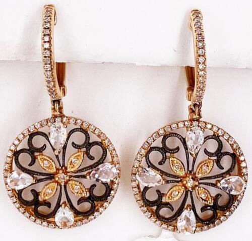 14KT ROSE GOLD LOVE HANGING EARRINGS. 3D MULTI HEART FLORAL OPEN FILIGREE CIRCULAR DESIGN. ROUND DIAMONDS ARE F/G COLOR, VSSI CLARITY .50 CARATS. AAA EXTRA FACETED ROUND WHITE TOPAZS ARE 1.19 CARATS. WRITTEN APPRAISAL AVAILABLE. COMES IN A PRESENTABLE GIFT BOX.
