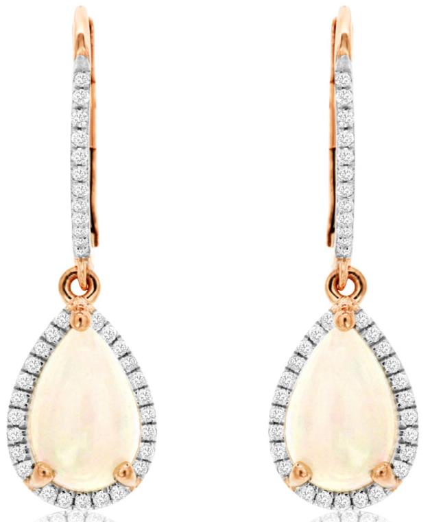 14KT ROSE GOLD LEVERBACK HANGING EARRINGS. 3D CLASSIC HALO DESIGN. ROUND DIAMONDS ARE F/G COLOR, VSSI CLARITY .22 CARATS. AAA PEAR SHAPE OPALS ARE 1.50 CARATS. WRITTEN APPRAISAL AVAILABLE. COMES IN A PRESENTABLE GIFT BOX.