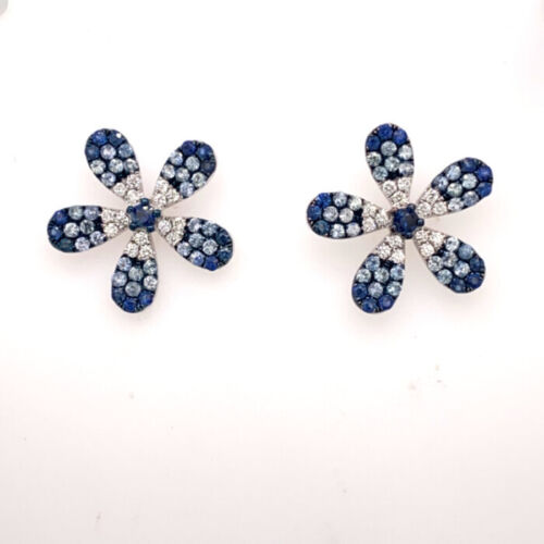 18KT WHITE GOLD STUD EARRINGS. 3D CLASSIC FLOWER DESIGN. DIAMONDS ARE F/G COLOR, VSSI CLARITY .25 CARATS. AAA SAPPHIRES ARE 1.47 CARATS. WRITTEN APPRAISAL AVAILABLE. COMES IN A PRESENTABLE GIFT BOX.