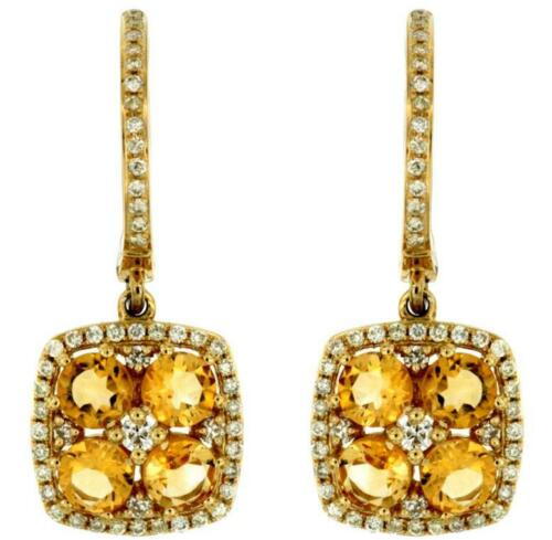 14KT YELLOW GOLD LEVERBACK HANGING EARRINGS. 3D FLOWER SQUARE DESIGN. DIAMONDS ARE F/G COLOR, VSSI CLARITY .38 CARATS. AAA CITRINES ARE 1.35 CARATS. WRITTEN APPRAISAL AVAILABLE. COMES IN A PRESENTABLE GIFT BOX.