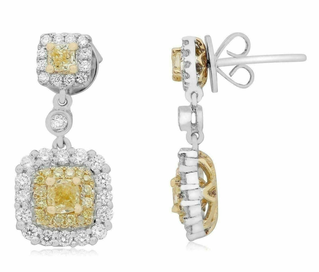 1.73CT WHITE & FANCY YELLOW DIAMOND 18K 2 TONE GOLD ETOILE HALO HANGING EARRINGS