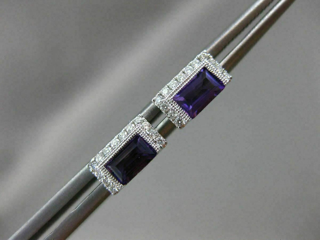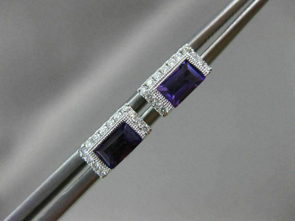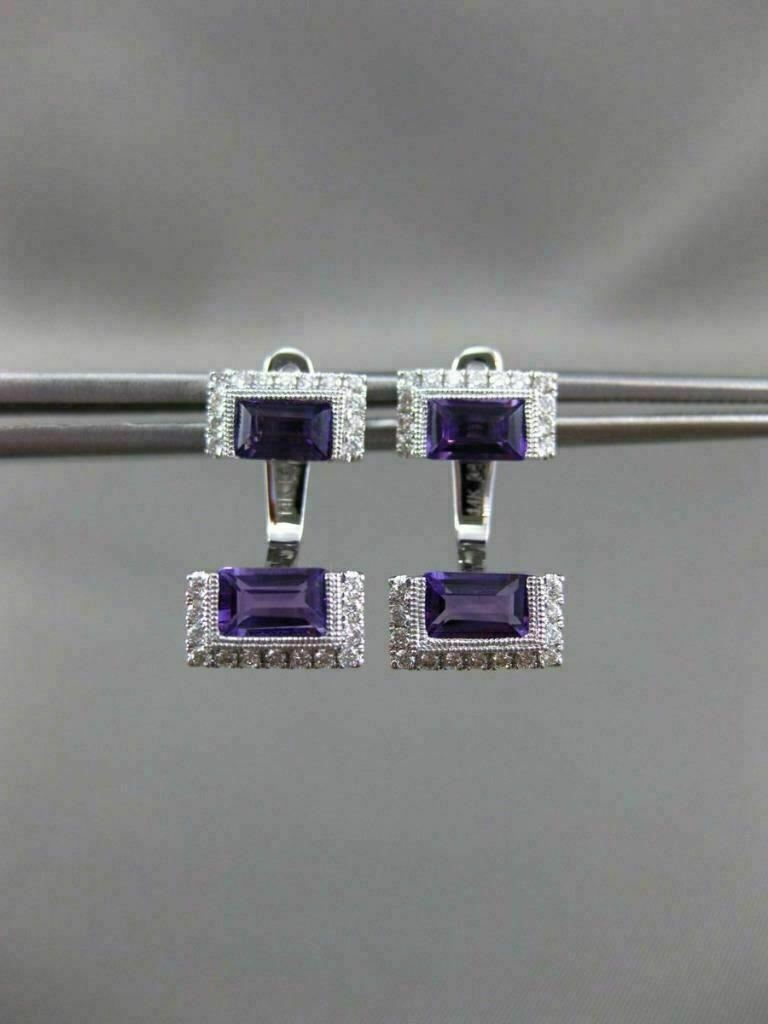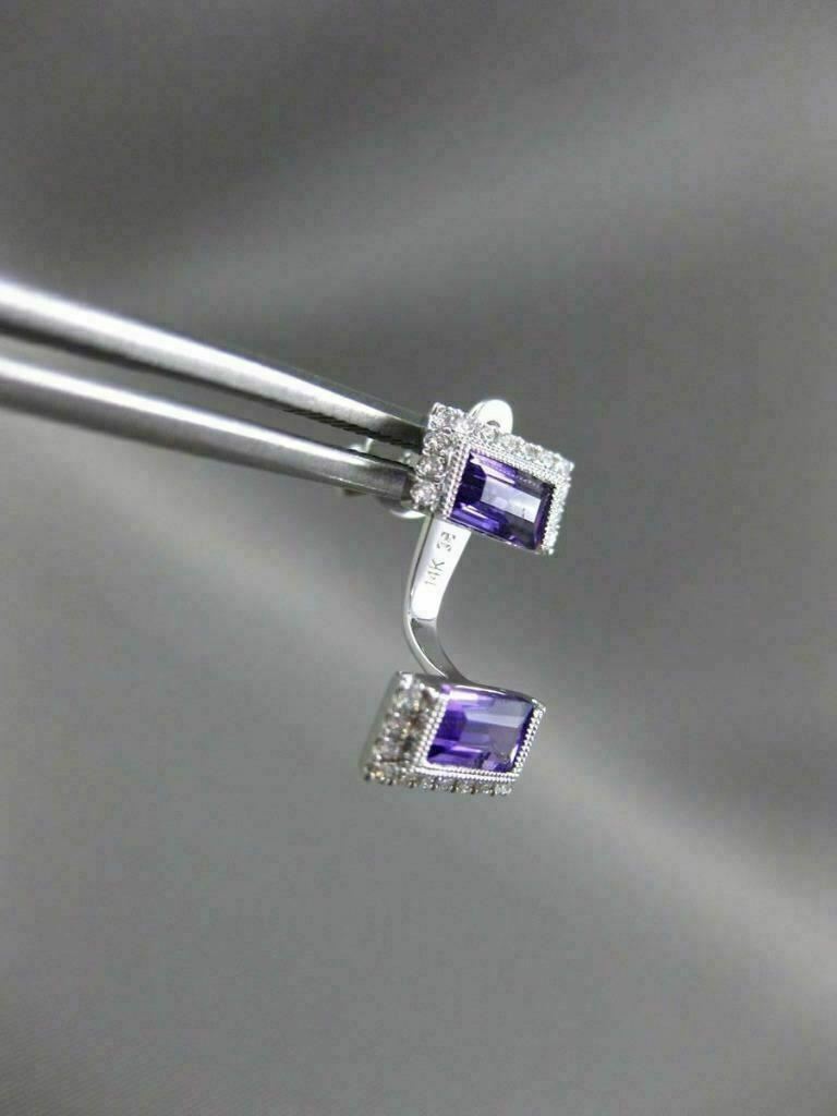 14KT WHITE GOLD HANGING EARRINGS. 3D RECTANGULAR MILGRAIN ILLUSION DESIGN. DIAMONDS ARE F/G COLOR, VSSI CLARITY .25 CARATS. AAA AMETHYST IS 1.50 CARATS. MEASURES 13.5mm X 8mm WIDE. WRITTEN APPRAISAL AVAILABLE. COMES IN A PRESENTABLE GIFT BOX