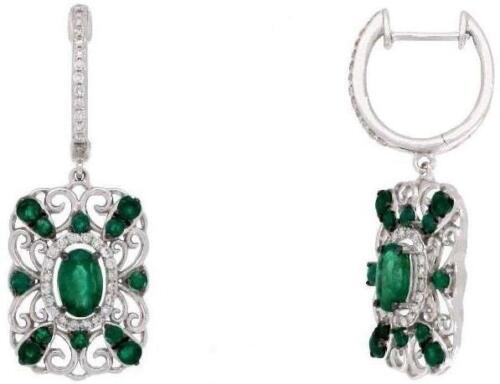 14KT WHITE GOLD HUGGIE HANGING EARRINGS. 3D MULTI HEART SQUARE FLOWER DESIGN. ROUND DIAMONDS ARE F/G COLOR, VSSI CLARITY .24 CARATS. AAA ROUND AND OVAL EMERALDS ARE 1.52 CARATS.