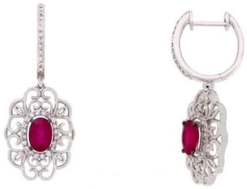14KT WHITE GOLD HANGING EARRINGS. 3D FLOWER OPEN FILIGREE DESIGN. ROUND DIAMONDS ARE F/G COLOR, VSSI CLARITY .28 CARATS. AAA OVAL RUBIES ARE 1.49 CARATS.
